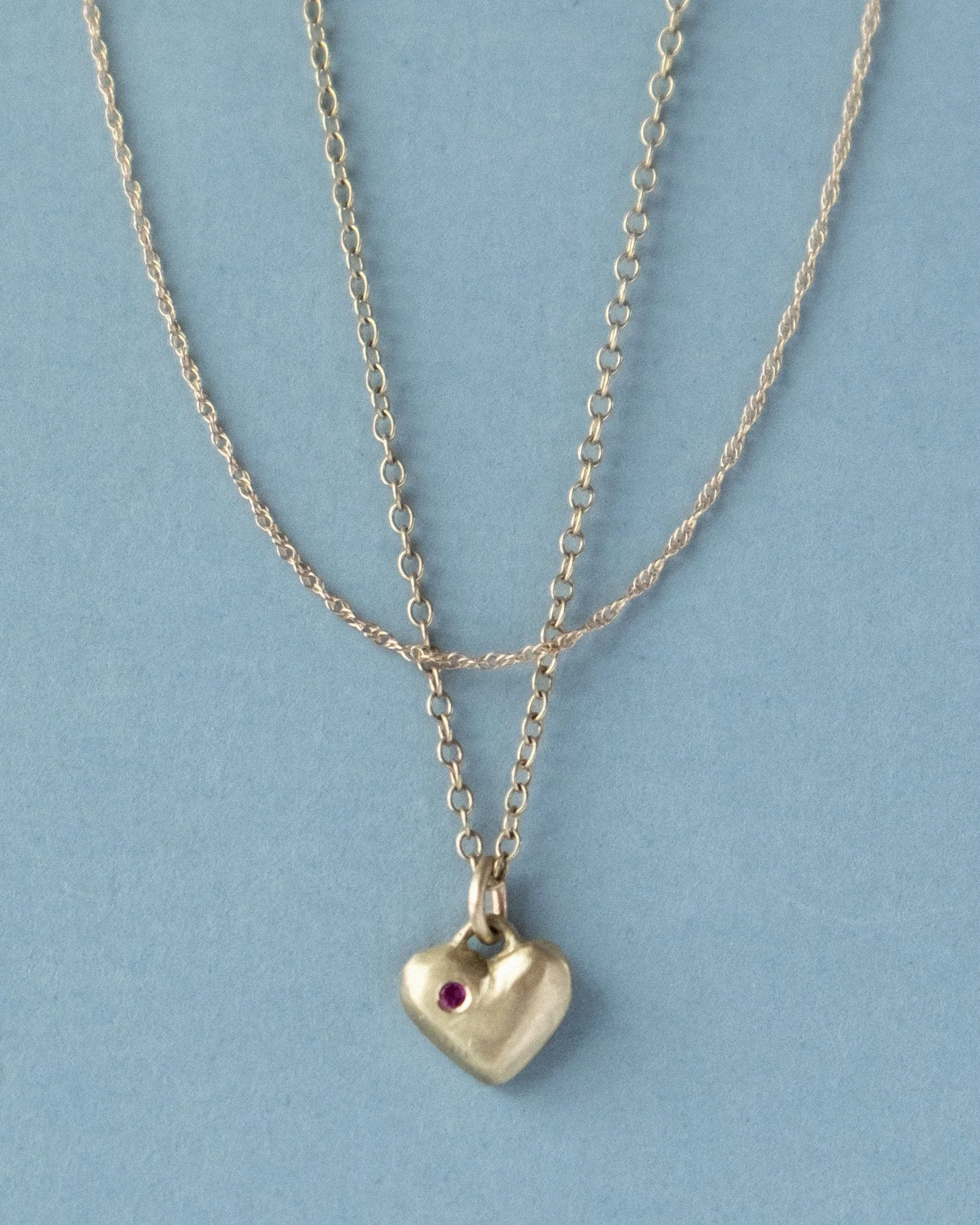 The sweetest Cora Heart Charm on a 1.5mm cable chain, layered with a separate 1.0mm rope chain.